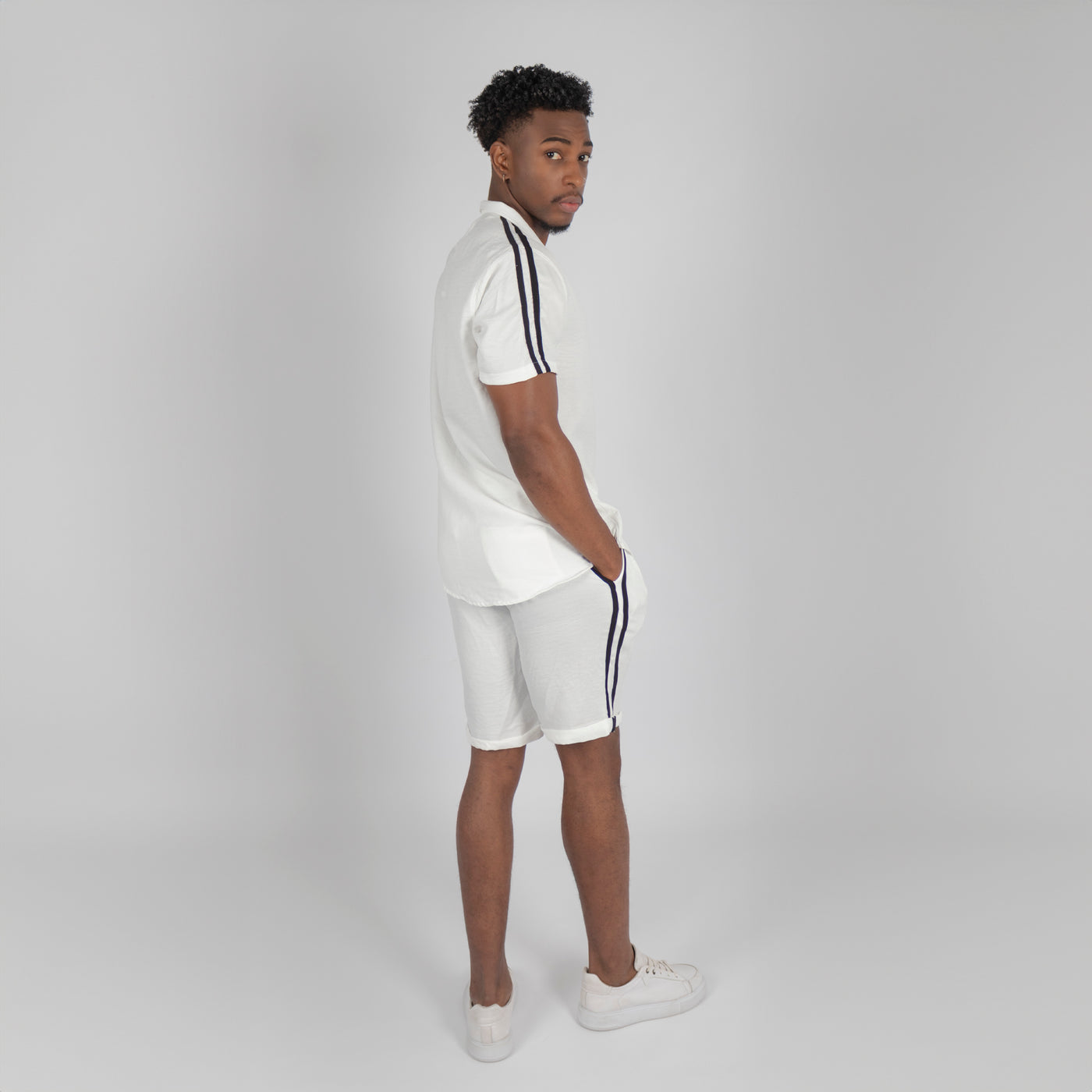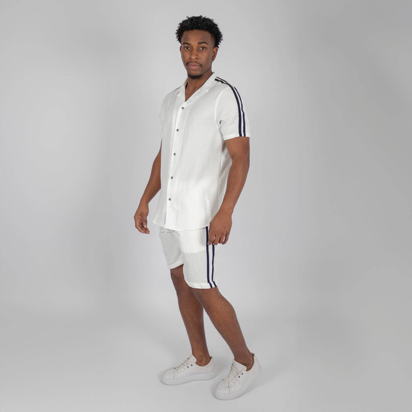 Disfruta de un estilo fresco y moderno con nuestro conjunto para hombre en color blanco con líneas en contraste de color. Hecho con materiales de alta calidad y un diseño elegante, este conjunto te mantendrá cómodo y con un aspecto sofisticado en cualquier ocasión.