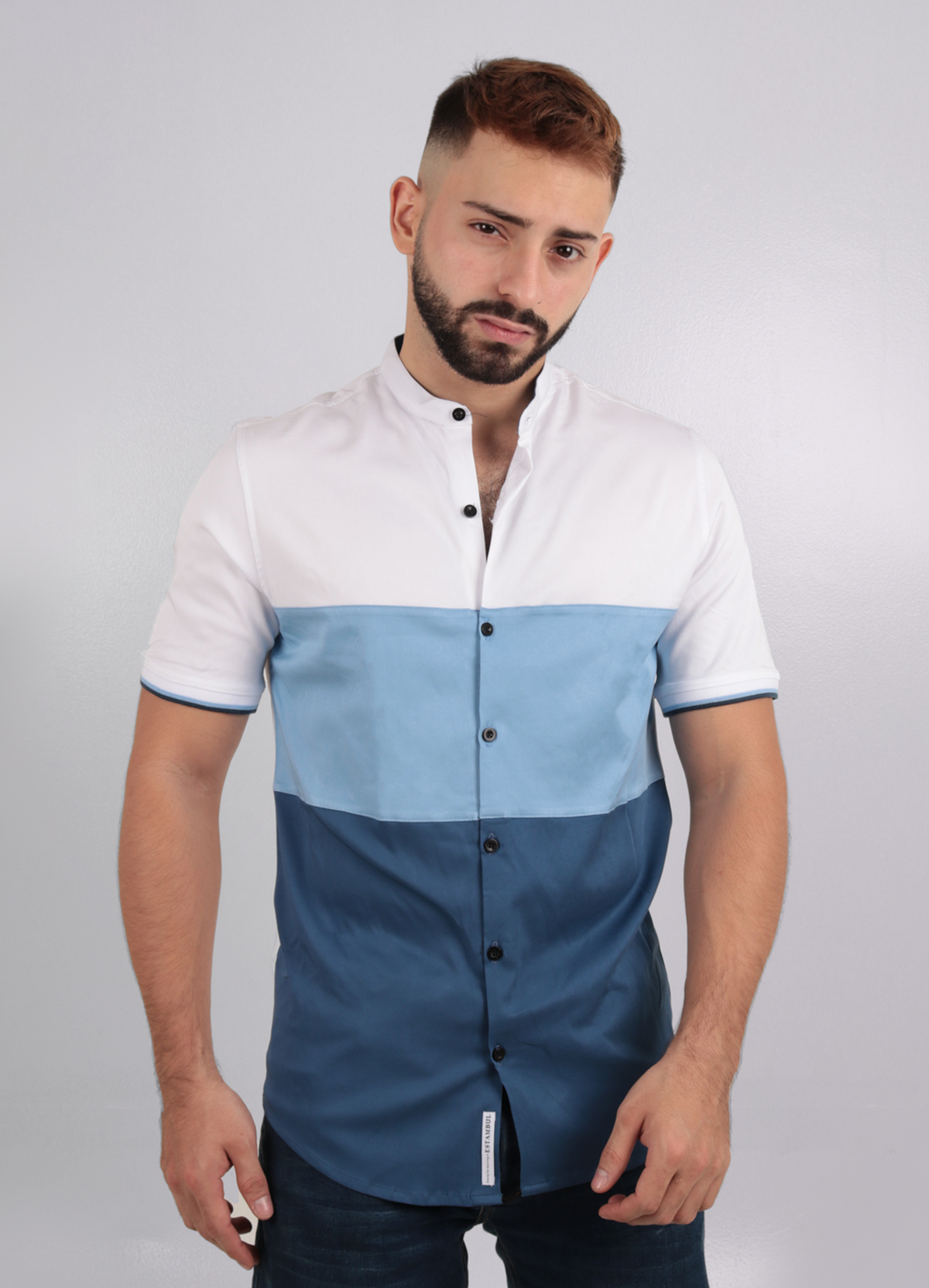 Una camisa elegante y moderna para hombres, con cortes y un cuello neru que le dan un toque único. Con una silueta slim y puños tejidos, esta camisa realza la figura y agrega un estilo sofisticado a cualquier atuendo. Haz una declaración audaz con nuestra camisa hombre Cortes.