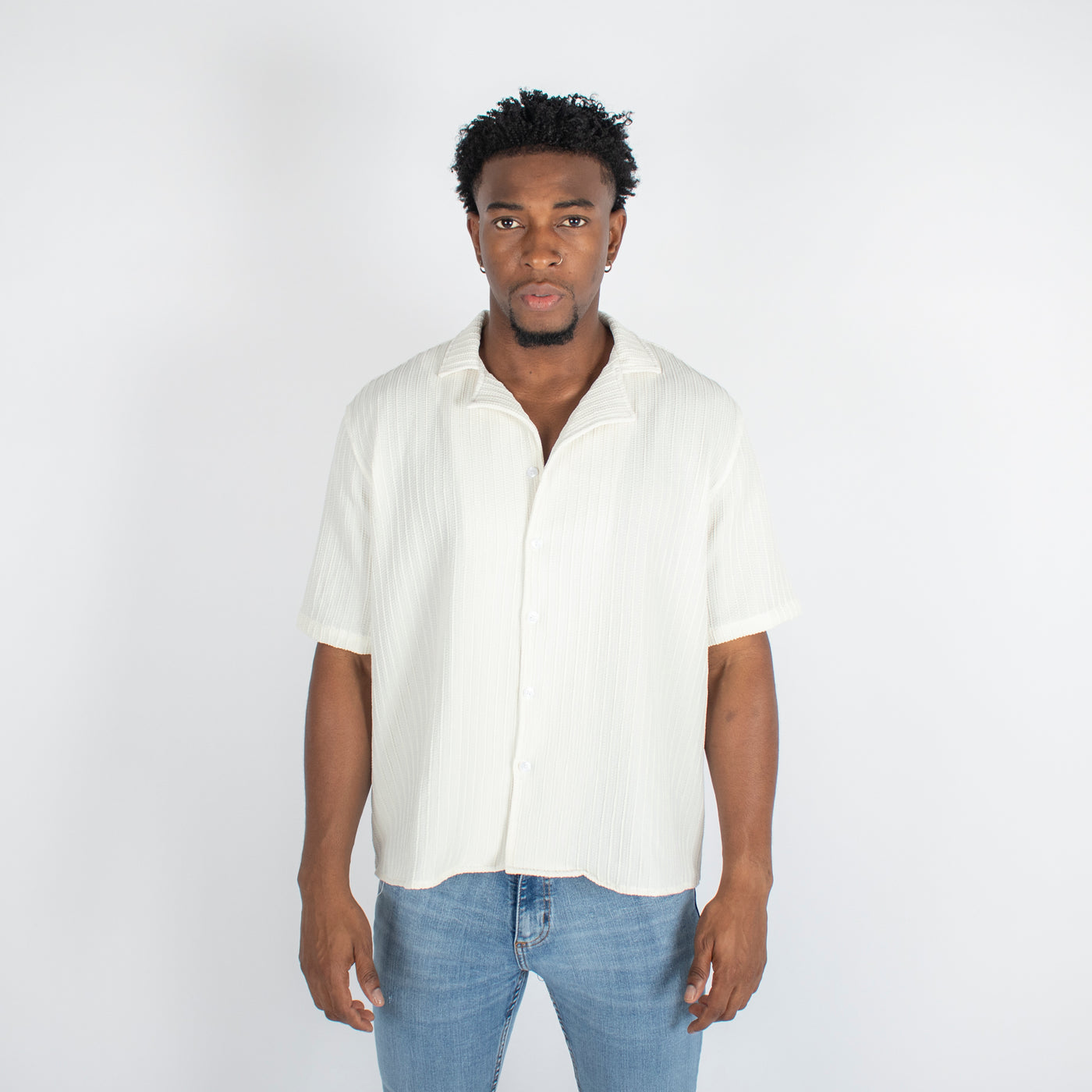 Esta Camisa de Hombre con cuello sport presenta una silueta boxy, perfecta para un estilo informal y vanguardista. Hecha con materiales de alta calidad, te brindará comodidad y un look moderno al mismo tiempo. Ideal para cualquier ocasión. ¡Haz una declaración de moda con esta camisa!
